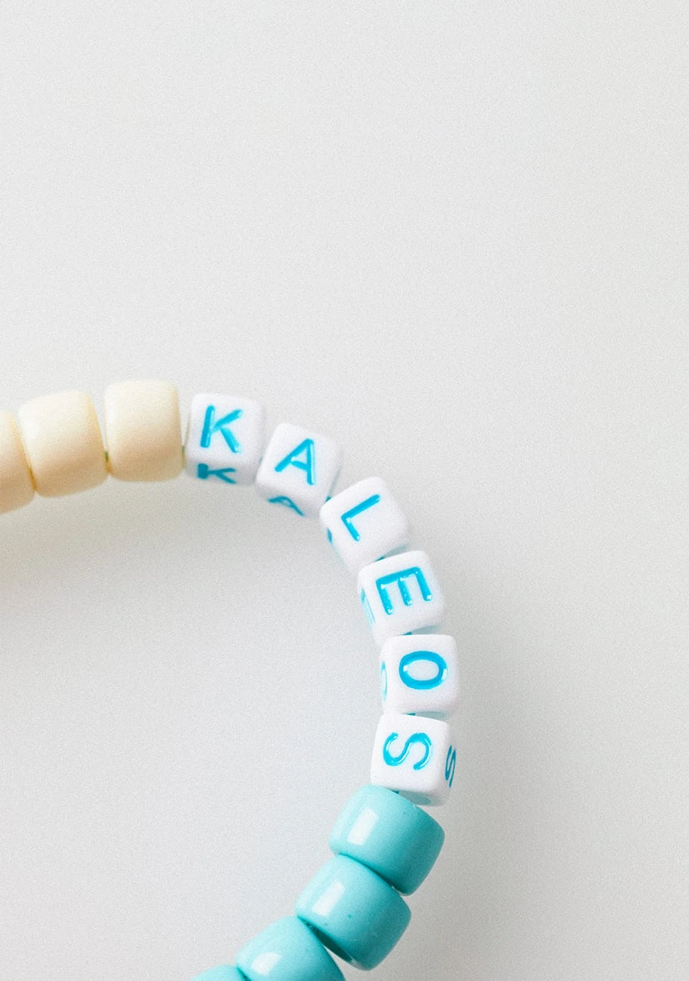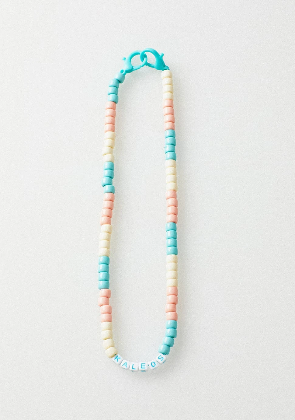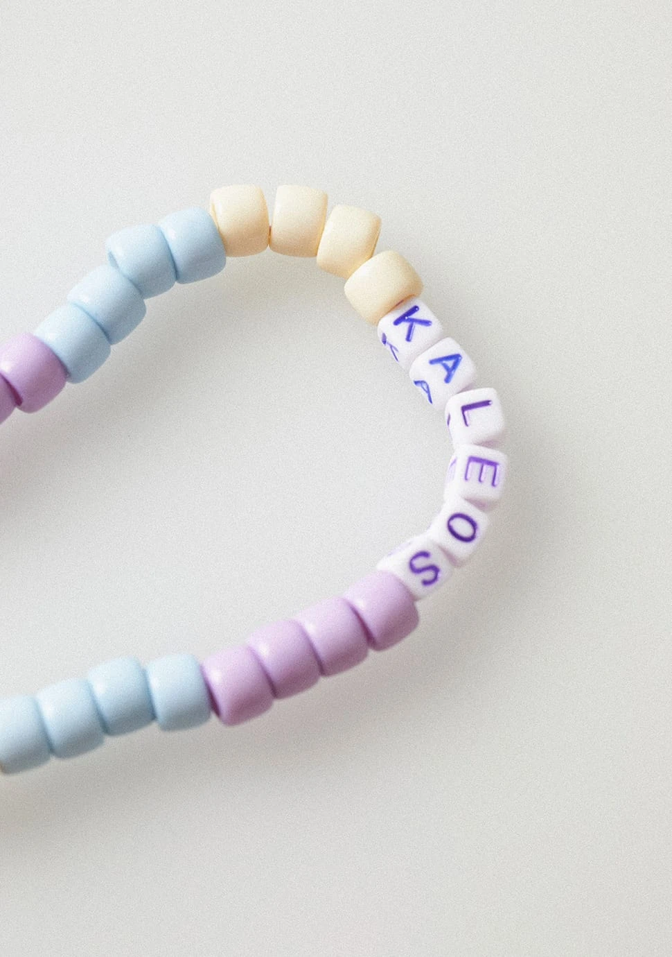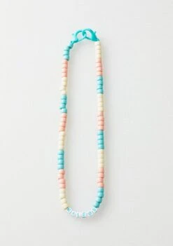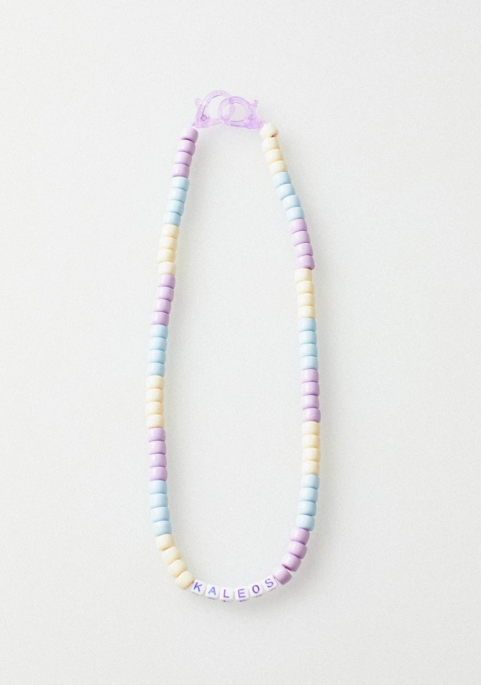 KIDS chain of resin beads with different colour blocks in tones of blue, lilac and white. Lilac double clasp to hold the glasses or wear as a necklace.Â