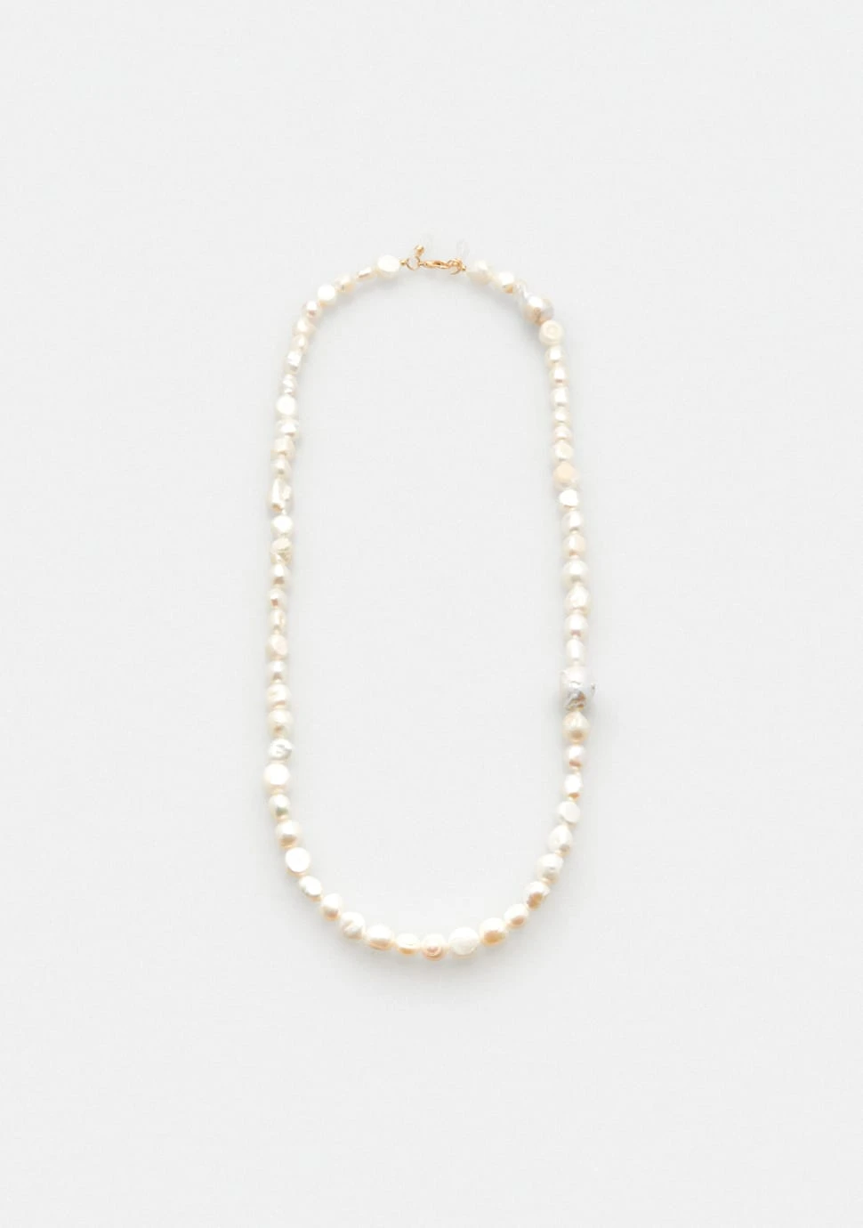 Natural pearl chain consisting of different sized pearls to give an organic look to any style. The white finish is elegant and timeless making this piece easy and comfortable to wear. With a double hook feature to hold any glasses of choice and added security.