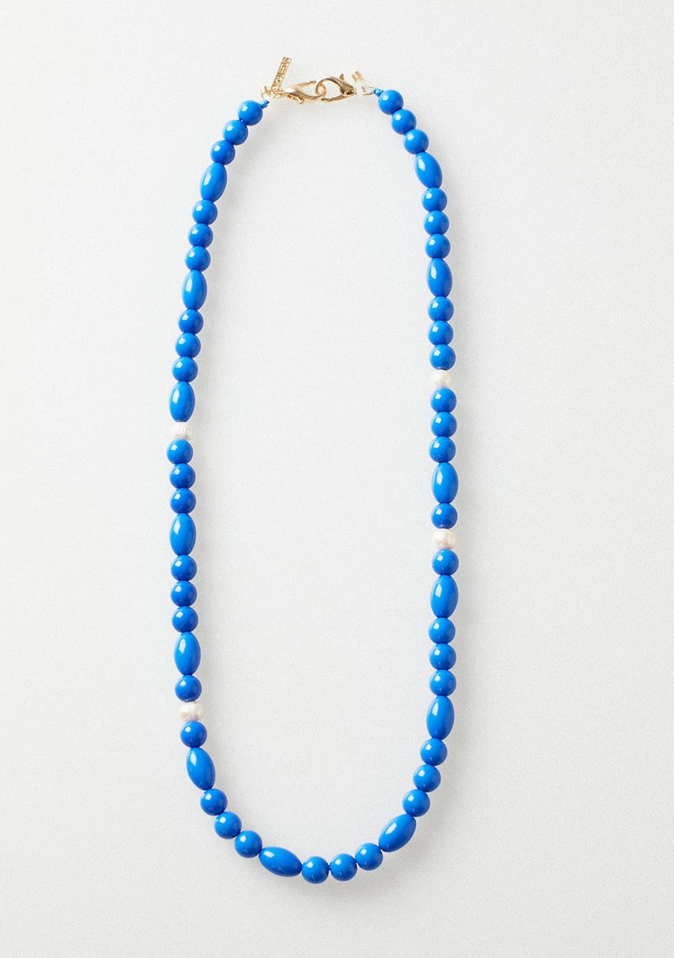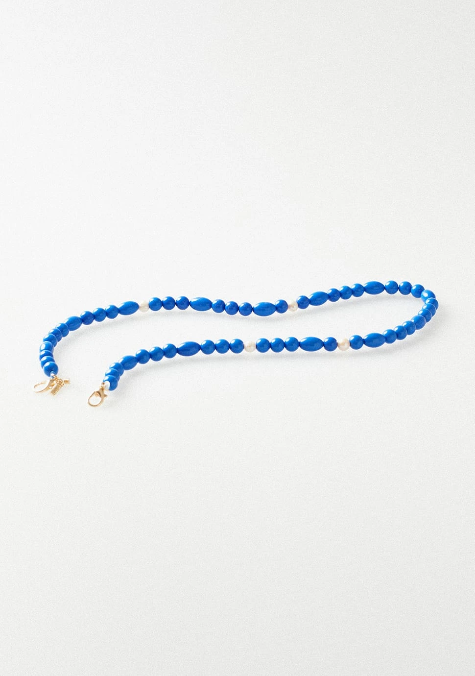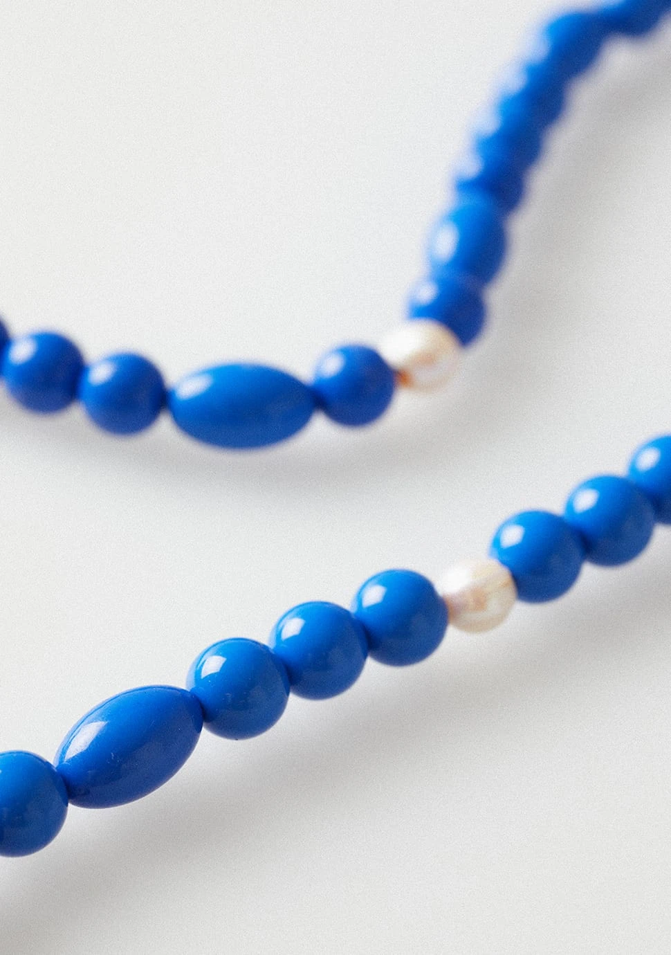 A luxury statement chain with beautifully finished blue resin beading and natural white pearls, The perfect mix of fun and elegance with the playful pop of colour. With a double hook feature to hold any glasses of choice with added security.Â